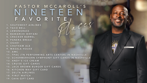We are looking forward to celebrating our Pastor's 19th Anniversary! If you are looking for gifts for our pastor, here is a list of his favorite places! We look forward to celebrating together on Sunday, August 24 at 9:30am at the MTSU Student Union Ballroom!